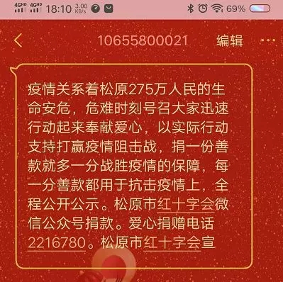 1月27日,继吉林省红十字会向社会发布募捐倡议后,松原市各级红十字会立即响应,相继通过广播、电视、报纸、网站、微信公众号等媒体阵地发布募捐倡议。2月4日,市红十字会通过市工信局联系三大运营商,以群发短信的方式发布了捐款倡议,群众反响热烈,踊跃捐款,目前市红十字会微信公众号已增加关注人数1300人,宣传效果显著。