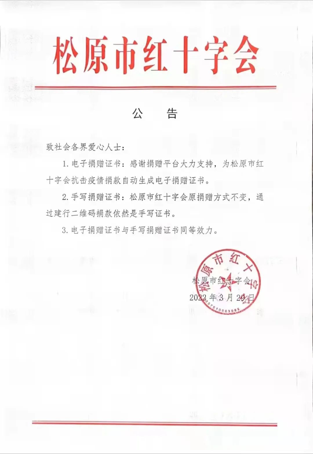 松原市红十字会关于捐赠证书开具方式的公告