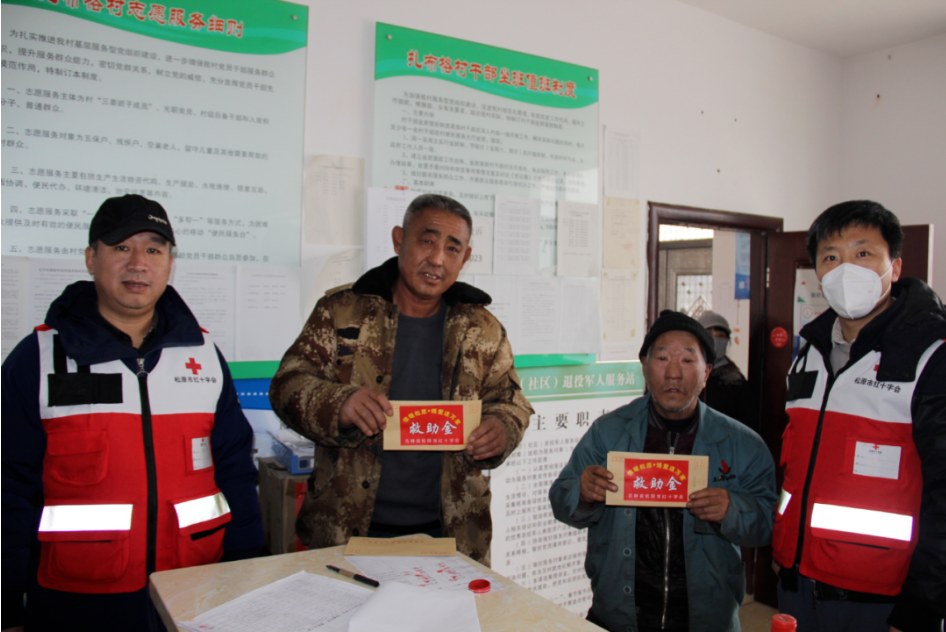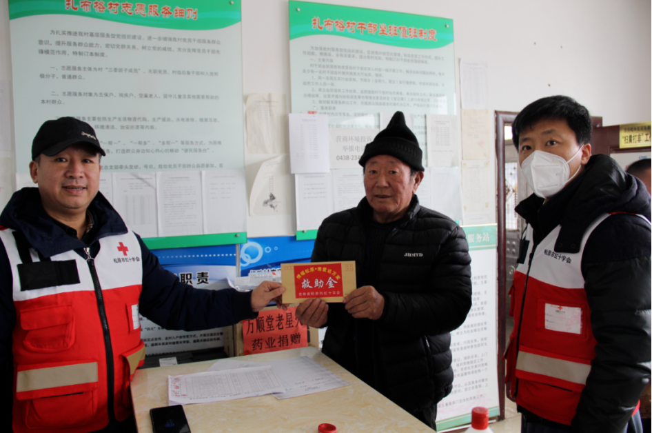 吉林省红十字会下拨慰问箱90个,价值26910元:分别下发各县区红十字会50箱,价值14950元;帮扶村40户边缘户40箱,价值11960元。为因重大疾病致困及来访打电话求助的180名困难人士发放人道救助金70600元。