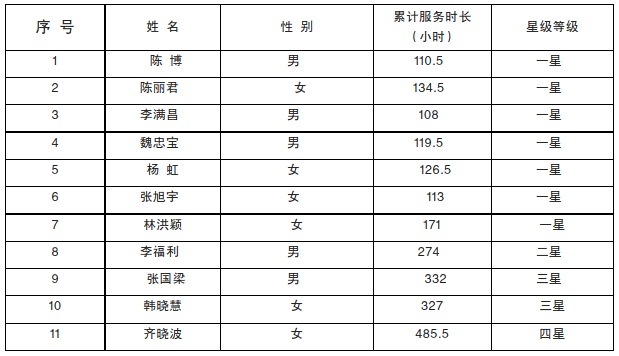 按照国务院《志愿服务条例》、民政部《志愿服务记录办法》以及中国红十字会总会《中国红十字志愿服务管理办法》(中红字〔2022〕34号)等有关规定,松原市红十字会根据红十字志愿者星级评定标准、程序、要求,对所属志愿者的志愿服务时长记录及服务质量进行审核(累计时长统计截止至 2023 年 12 月 31 日),拟评定李满昌等7名同志为一星级红十字志愿者、李福利同志为二星级红十字志愿者、韩晓慧等2名同志为三星级红十字志愿者、齐晓波同志为四星级红十字志愿者。
