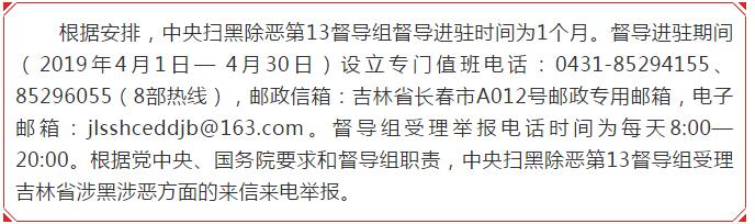 为深入贯彻落实习近平总书记重要讲话指示精神和党中央、国务院决策部署,中央扫黑除恶第13督导组1日进驻吉林省开展工作。当日,中央扫黑除恶第13督导组督导吉林省工作动员会在长春召开。中央扫黑除恶第13督导组组长李景田同志、副组长张志杰同志就做好督导工作分别讲话。受正在出访的吉林省委书记巴音朝鲁同志委托,吉林省委副书记、省长景俊海同志作动员讲话。