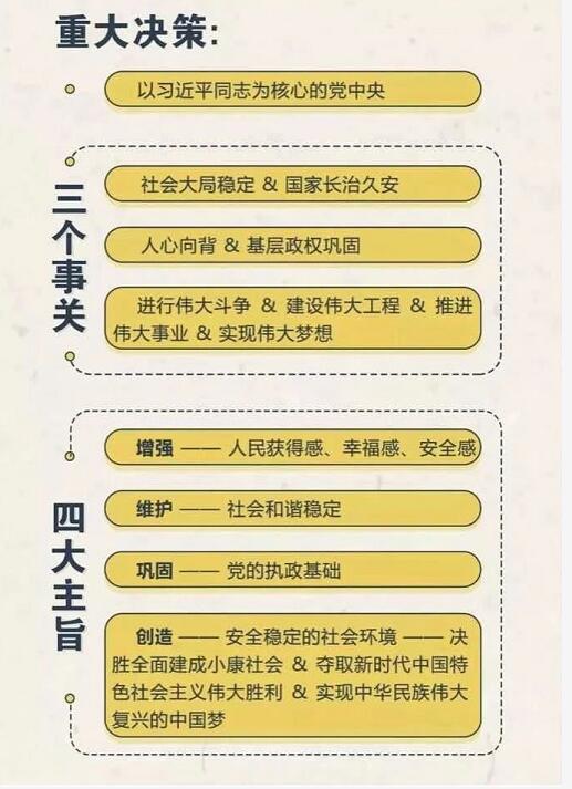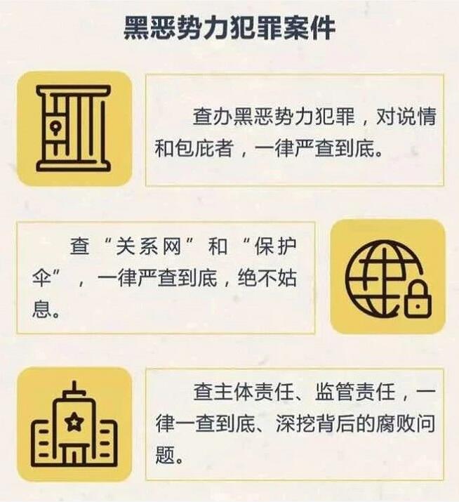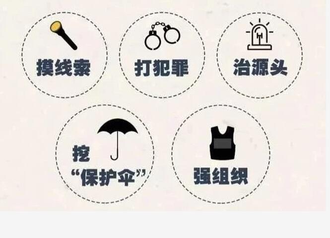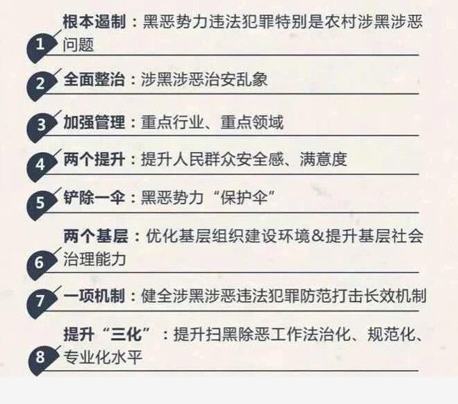 3、扫黑除恶专项斗争要开展多久? 扫黑除恶专项斗争为期三年,至2020年底结束。 4、扫黑除恶专项斗争的总蓝图是什么? ①2018年——打击遏制年:深入推进扫黑除恶专项斗争,黑恶势力违法犯罪突出问题得到有效遏制,在全社会形成对黑恶势力人人喊打的浓厚氛围; ②2019年——深挖根治年:对尚未攻克的重点案件、重点问题、重点地区集中攻坚,对已侦破的案件循线深挖、逐一见底,彻底铲除黑恶势力赖以滋生的土壤; ③2020年——长效长治年:建立健全遏制黑恶势力滋生蔓延的长效机制,取得扫黑除恶专项斗争压倒性胜利。 5、扫黑除恶专项斗争工作的总体要求是什么? 有黑扫黑、无黑除恶、无恶治乱。 6、扫黑除恶专项斗争的总体目标是什么? 通过3年不懈努力,黑恶势力违法犯罪特别是农村涉黑涉恶问题得到根本遏制,涉黑涉恶治安乱点得到全面整治,重点行业、重点领域、重点人群管理得到明显加强,人民群众安全感、满意度明显提升;黑恶势力“保护伞”得以铲除,加强基层组织建设的环境明显优化;基层综治组织作用进一步强化,基层社会治理能力明显提升;涉黑涉恶违法犯罪防范打击长效机制更加健全,扫黑除恶工作法治化、规范化、专业化水平进一步提高。.
