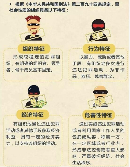 21、黑社会性质组织的“组织特征”主要指什么? 形成较稳定的犯罪组织,人数较多,有明确的组织者、领导者,骨干成员基本固定,并有比较明确的层级和职责分工。 22、黑社会性质组织的“经济特征”主要指什么? 有组织地通过违法犯罪活动或者其他手段获取经济利益,具有一定的经济实力,以支持该组织的活动。 23、黑社会性质组织的“行为特征”主要指什么? 以暴力、威胁或者其他手段,有组织地多次进行违法犯罪活动,为非作恶,欺压、残害群众。 24、黑社会性质组织的“危害性特征”主要指什么? 通过实施违法犯罪活动,或者利用国家工作人员的包庇或者纵容,称霸一方,在一定区域或者行业内,形成非法控制或者重大影响,严重破坏经济、社会生活秩序。.