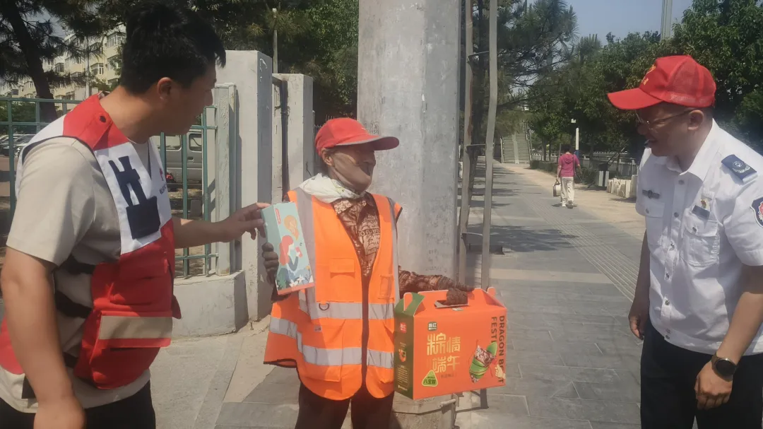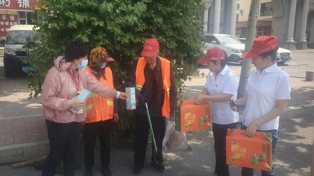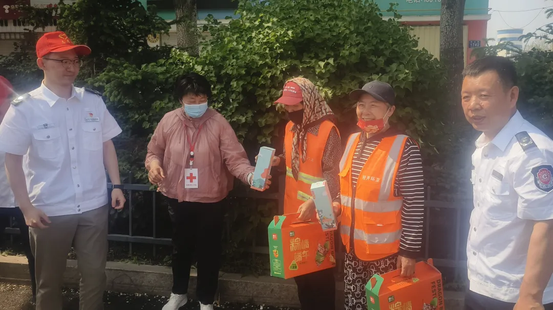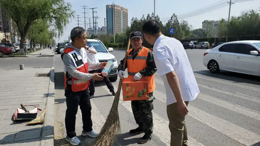 5月29日上午,市红十字会干部职工和红十字志愿者、市烟草专卖局专卖管理科党支部党员一行走上街头,为正在外滩路、沿江路、松原大路进行清扫作业的20余名环卫工人送上爱心粽子和保温水杯,大家与环卫工人亲切交谈,叮嘱他们注意身体,做好防暑降温,并带去端午暖心祝福,让他们感受到党和政府的关怀和温暖。本次慰问活动共发放了价值2000余元的爱心粽子和保温水杯,把党和政府的关心关怀送到了环卫工人心坎上。