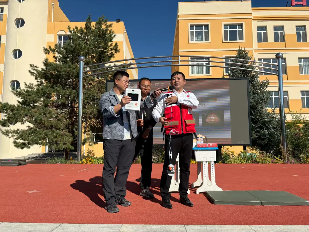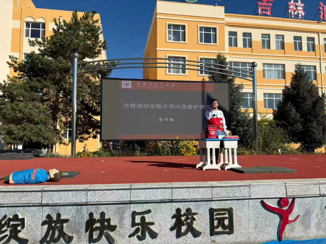 当天清晨,千余名师生及家长齐聚油田实验小学操场,一场生命教育的知识盛宴在此拉开帷幕。培训由省级培训讲师、五星级红十字志愿者宿润楠主讲。宿老师针对学生的年龄特点和接受能力精心设置课程,首先普及了火灾地震逃生、踩踏避险、犬咬伤应急处置、乘车安全等知识,接下来以生动易懂的语言,系统讲解了心肺复苏术、气道异物梗阻急救(海姆立克急救法)、AED的使用方法、包扎止血、关节扭伤处理等实用技能,通过真实案例引导师生与家长认识到自救互救的重要性,并通过案例弘扬助人美德。