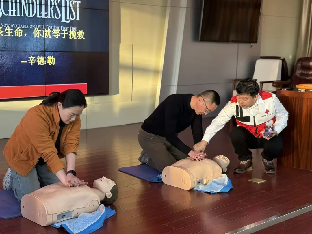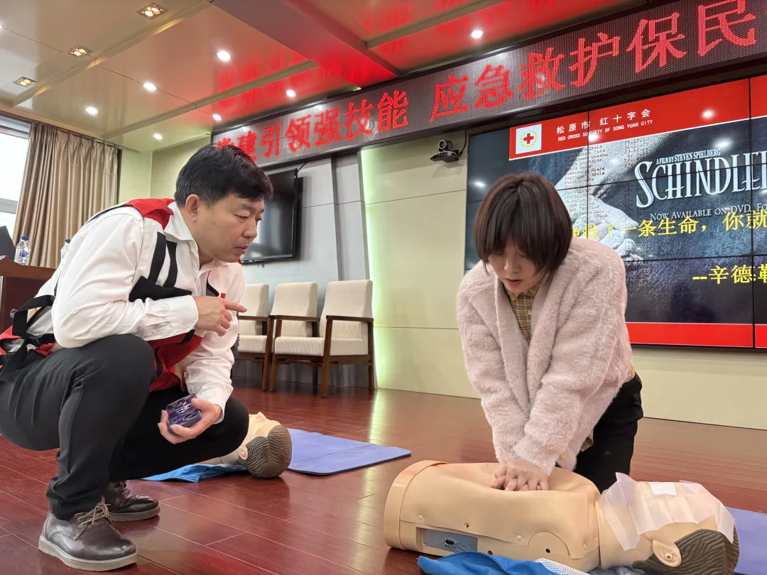红十字会培训讲师向党员干部普及了红十字运动知识,传授了心肺复苏术、AED操作使用、海姆立克急救法等急救技能,并组织一对一实操指导。活动结束后,15名党员干部通过了红十字会的理论知识和实操考核,获得红十字急救员证书。