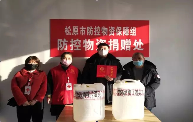 2月10日下午,松原市宁江区老兵酒业向松原市红十字会捐赠640斤75%酒精,总价值18560元。用于支持松原市疫情防控工作。