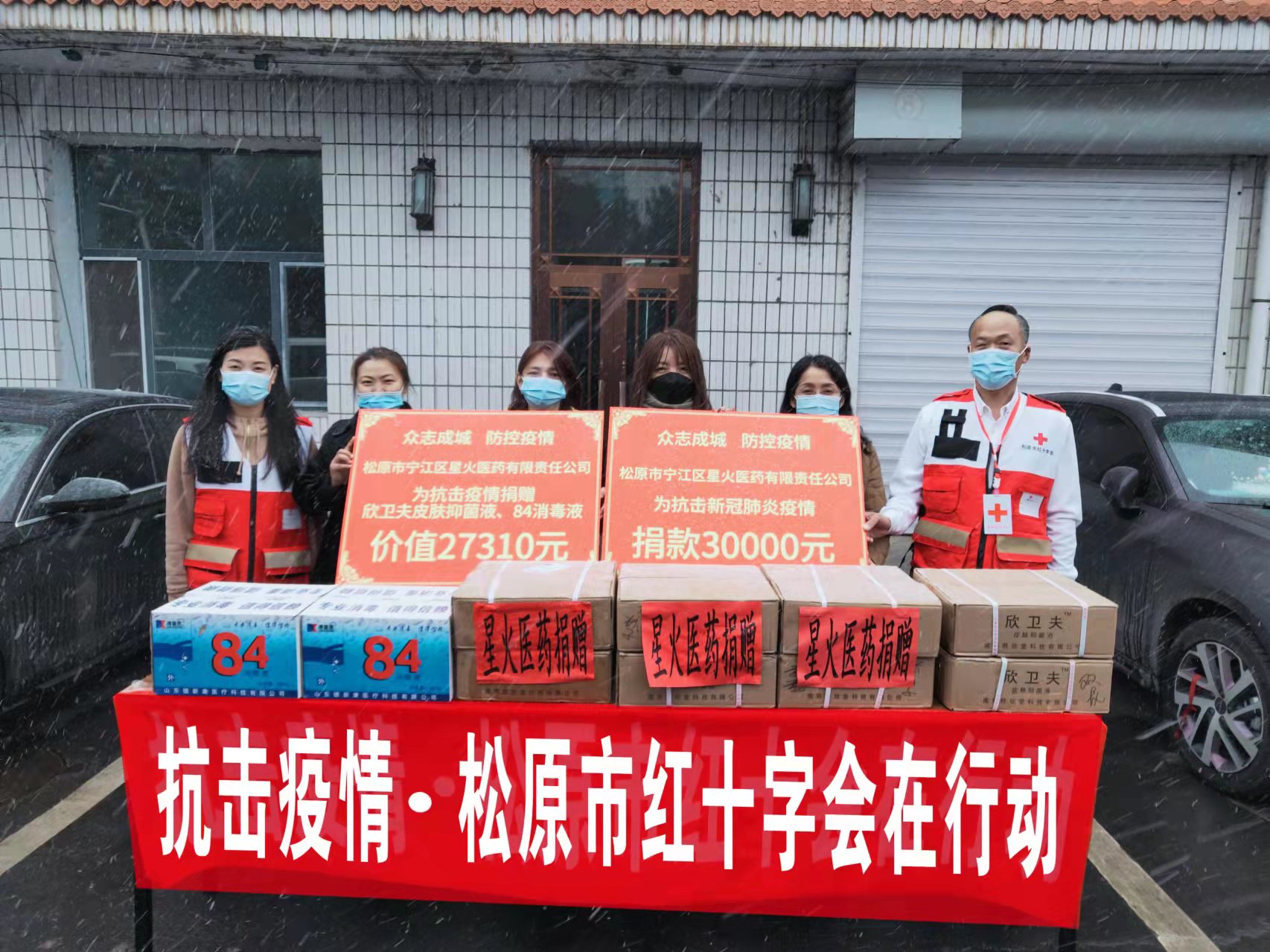 3月15日下午,松原市宁江区星火医药有限责任公司捐赠了总价值57310元的抗疫款物。其中:向市红十字会捐款30000元,通过市红十字会向市疫情防控物资保障组定向捐赠了欣卫夫皮肤抑菌液和84消毒液2000瓶,总价值27310元,用于支持疫情防控。