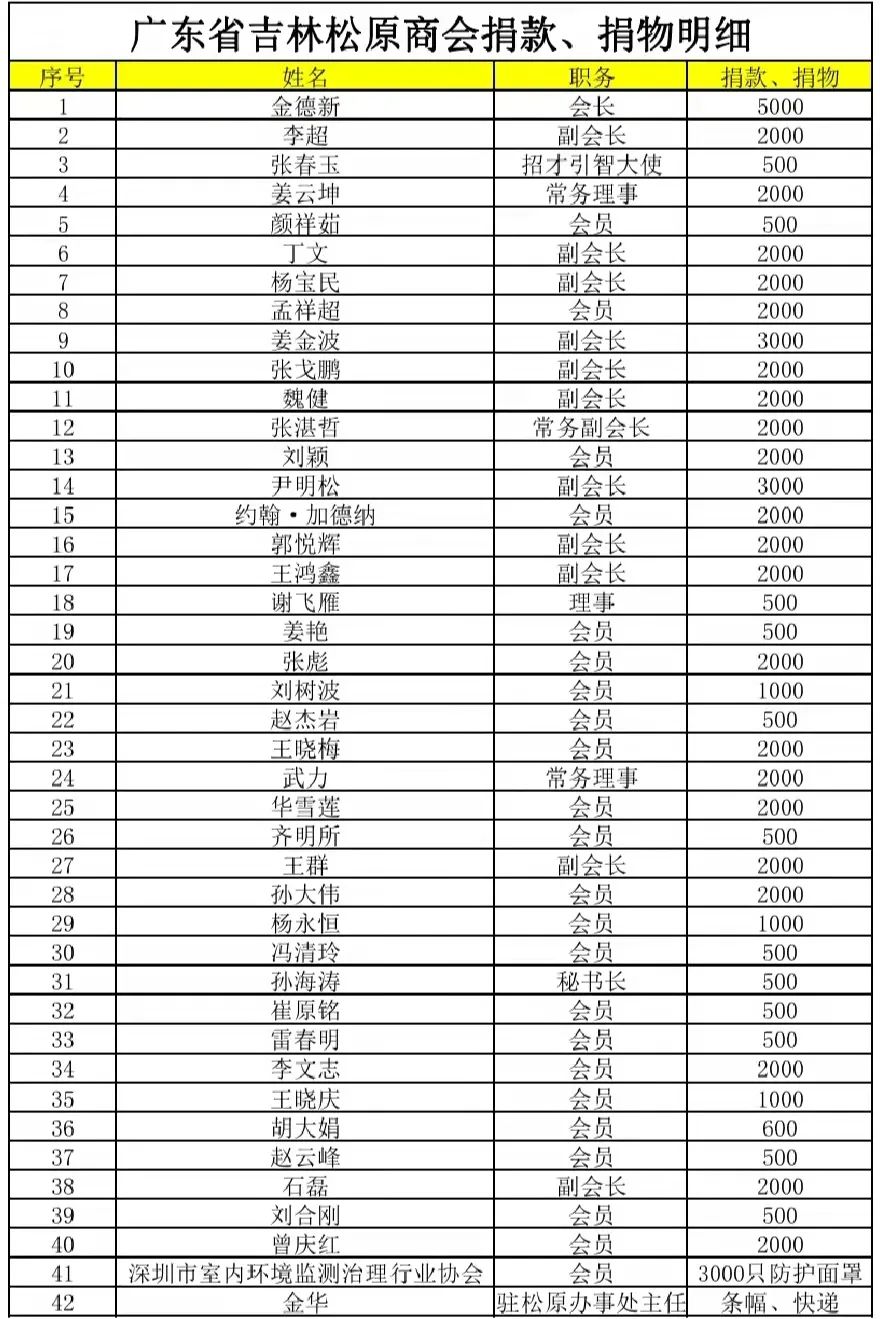 在商会会长金德新的号召下,自3月16日发出《关于恳请帮助吉林抗击新冠疫情的倡议书》以来,得到了商会会员、老乡的热烈响应,纷纷踊跃捐款、捐物。截至3月18日晚上8时,共有42个爱心单位和个人认捐,累计捐款金额达62600元,3000个防护面罩(捐赠物资总价值12000元),合计总价值74600元。此外另有其他捐赠物资正在邮寄途中。