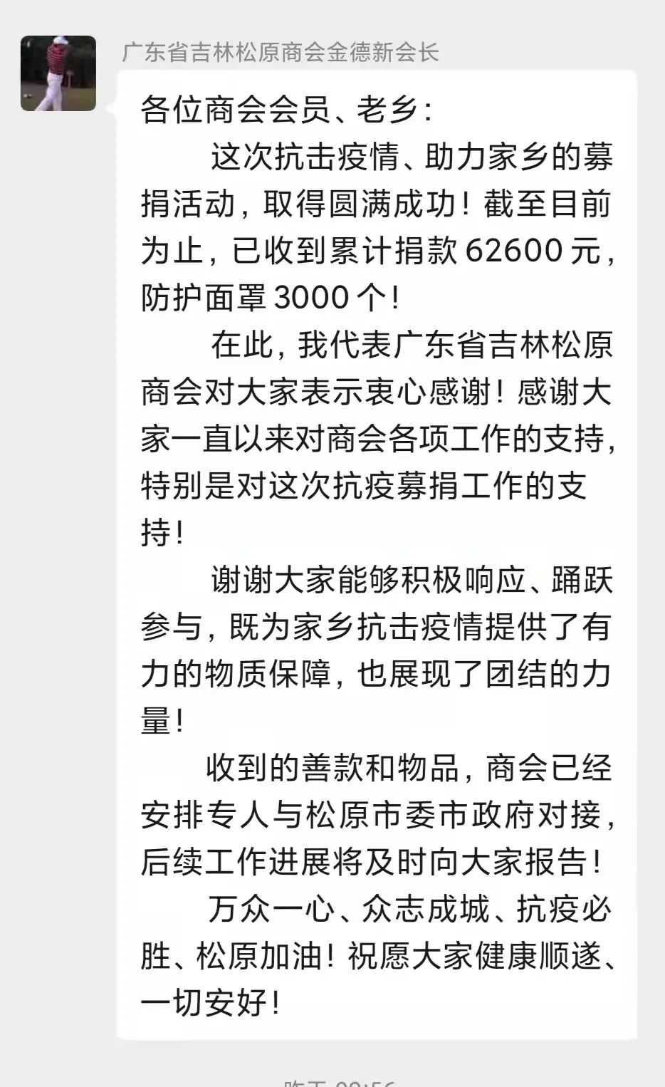 疫情当前,广大商会会员、老乡凝心聚力,勇于担当,彰显了造福松原的家乡情怀和高度的社会责任感。广东省吉林松原商会将继续与各方携手助力疫情防控,心系家乡,共克时艰,渡过当下难关。
