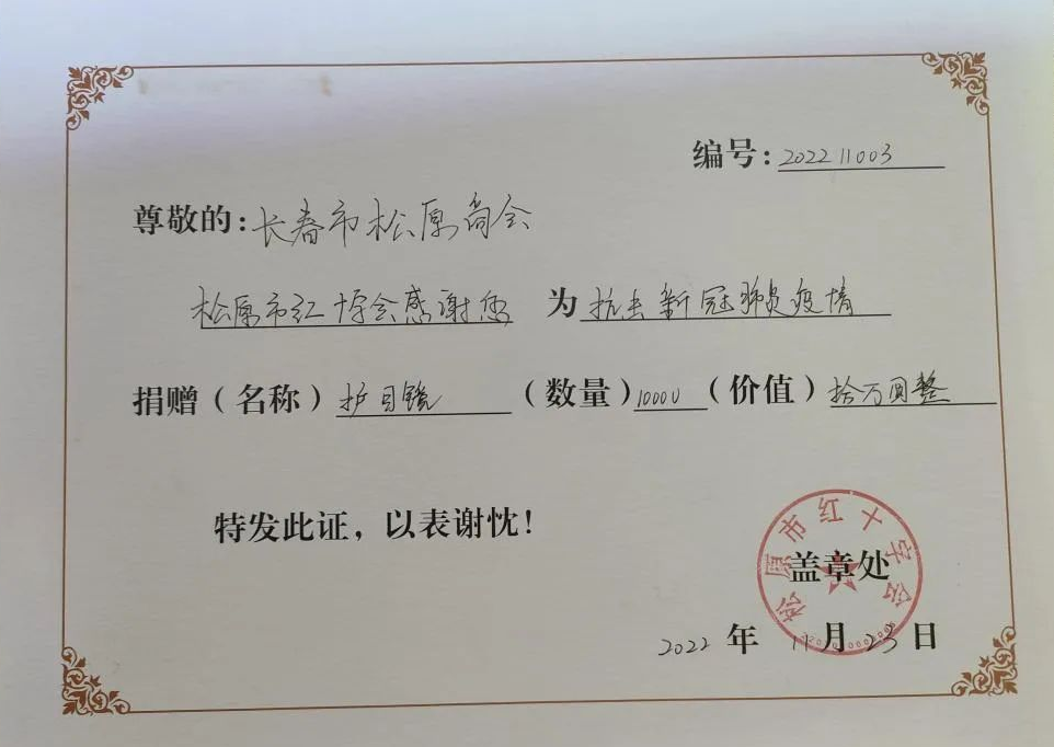凝心聚力抗疫情,爱心捐赠暖人心。面对当前松原市严峻的疫情防控形势,11月23日,长春市松原商会通过市红十字会定向捐赠给市物资保障组10000副护目镜用于支持疫情防控工作,总价值10万元整。长春市松原商会以实际行动彰显企业责任和社会担当。用一箱箱爱心物资,传递一份份真情!