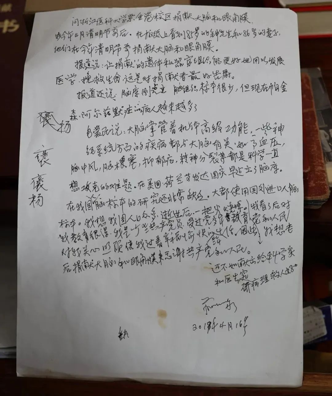 “党和人民对我的关心和照顾,使我过着愉快的老年生活,因此我想只有身后捐献大脑和眼角膜来感谢共产党和人民。”